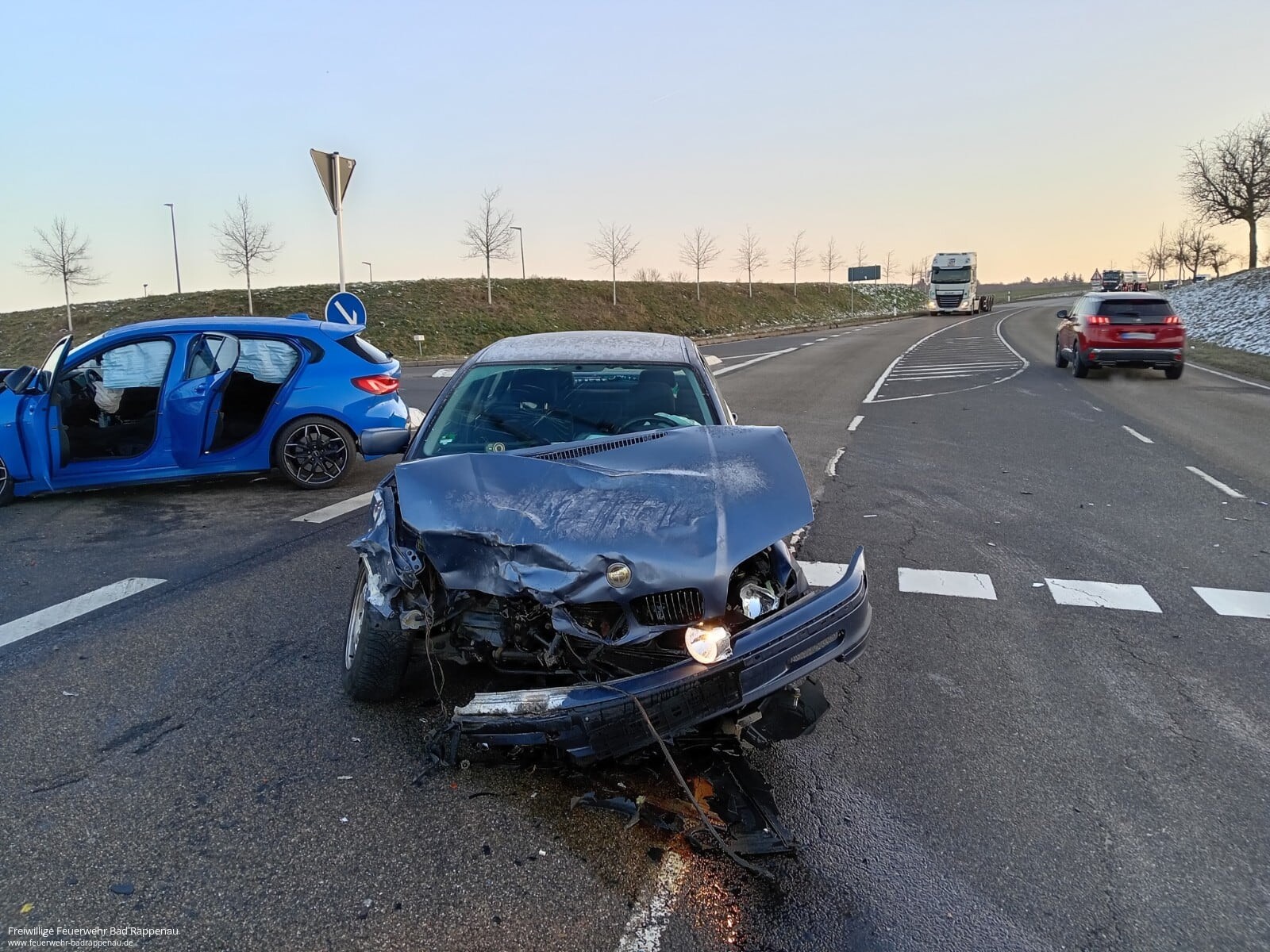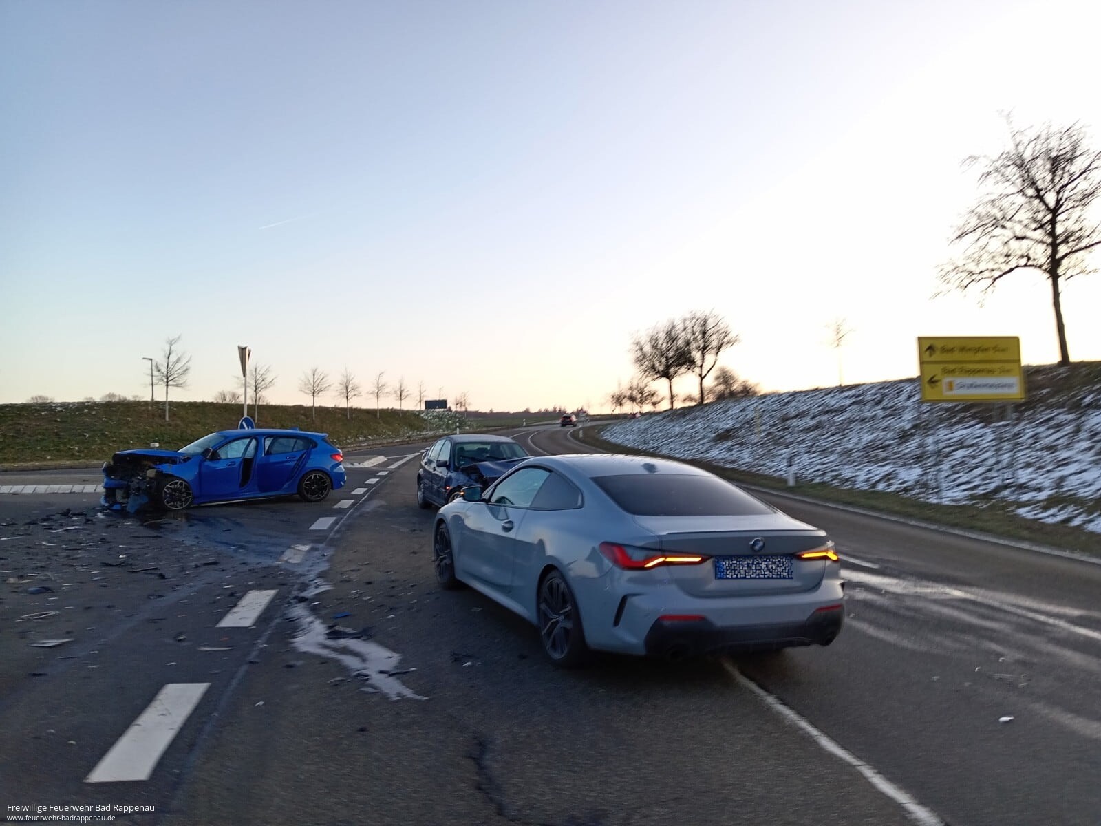 Am Montagmorgen ereignete sich an der Kreuzung L1107/Kieselhälde in Bad Rappenau-Bonfeld ein Verkehrsunfall, bei dem drei Personen verletzt wurden. Der Rettungsdienst übernahm die Versorgung der Verletzten.Unsere Aufgabe bestand darin, die Fahrzeugbatterien fachgerecht abzuklemmen. Die Straßenmeisterei, die sich direkt an der Kreuzung befindet, übernahm die Reinigung der Fahrbahn.Wir waren mit zwei Fahrzeugen etwa 50 Minuten im Einsatz.
