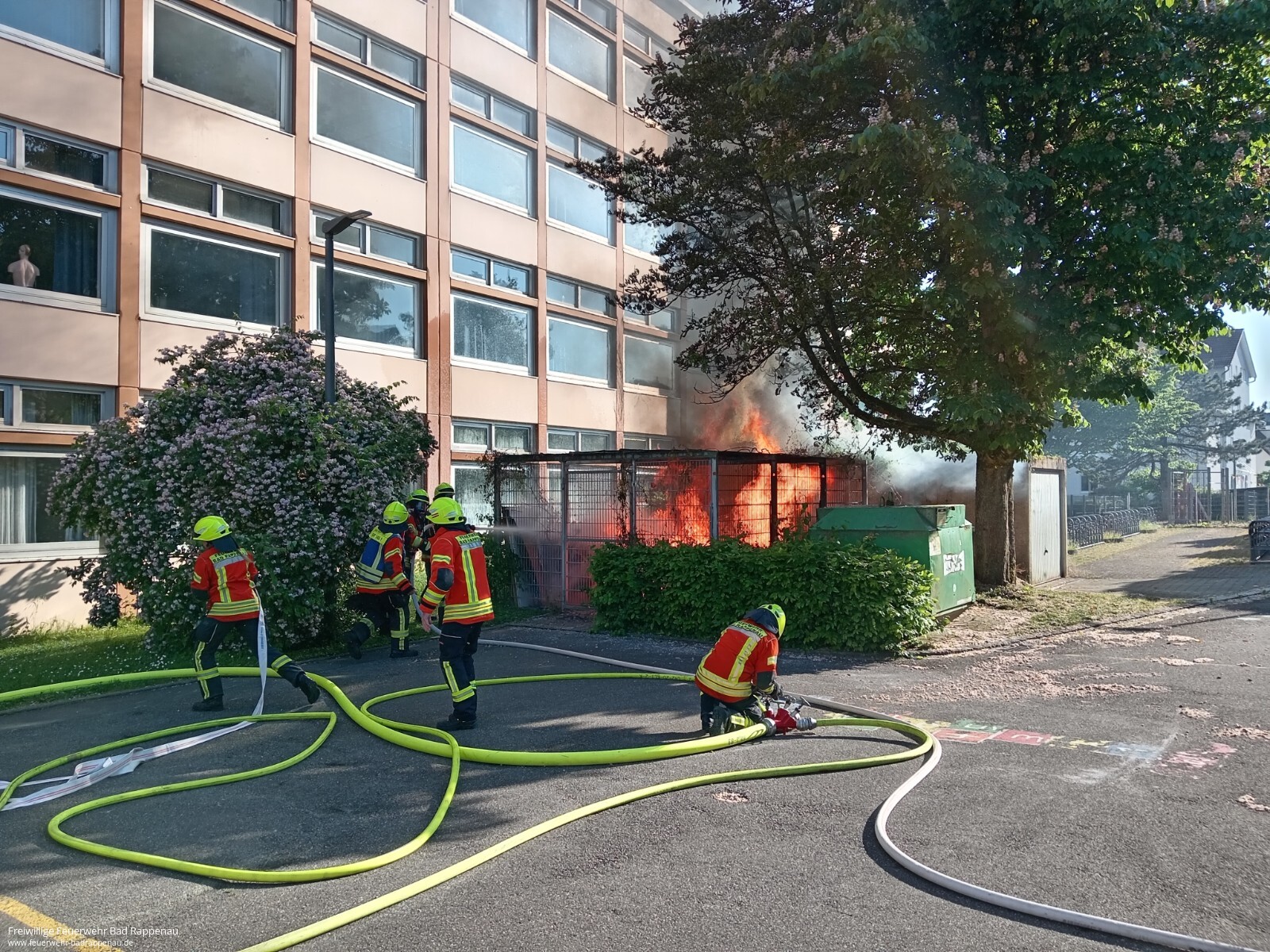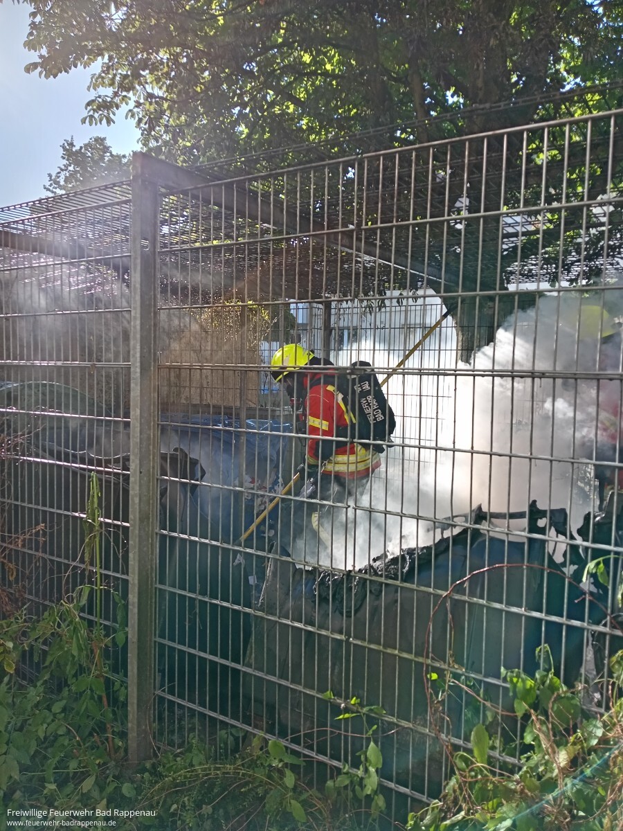 Noch bevor die Einsatzkräfte vom vorherigen Mülleimerbrand zur Feuerwache zurückgekehrt waren, informierte uns die Leitstelle Heilbronn über Funk über einen weiteren gemeldeten Mülleimerbrand an der Verbundschule in Bad Rappenau.Die Besatzung des HLF 20 drehte um und machte sich unmittelbar auf den Weg zur neuen Einsatzstelle. Nur wenige Minuten später trafen die ersten Kräfte ein. In einer Einhausung standen mehrere Mülltonnen bereits in Vollbrand.Ein Trupp unter Atemschutz begann umgehend mit der Brandbekämpfung. Dabei wurden auch angrenzende Gebäudeteile, insbesondere eine Hauswand, gekühlt und die Flammen erfolgreich eingedämmt. Nach dem Öffnen der Einhausung konnten Glutnester auseinandergezogen und vollständig abgelöscht werden.Während der Löscharbeiten wurde das Einsatzstichwort erhöht, um zusätzliche Kräfte zur Sicherstellung der Wasserversorgung sowie zur Belüftung der betroffenen Schulräume nachzualarmieren. Durch teils gekippte Fenster war erheblicher Rauch ins Gebäude eingedrungen.Die Polizei war mit drei Streifenwagen vor Ort und hat die Ermittlungen aufgenommen. Im Raum steht der Verdacht auf Brandstiftung – insbesondere aufgrund der zeitlichen und räumlichen Nähe der beiden Brände.