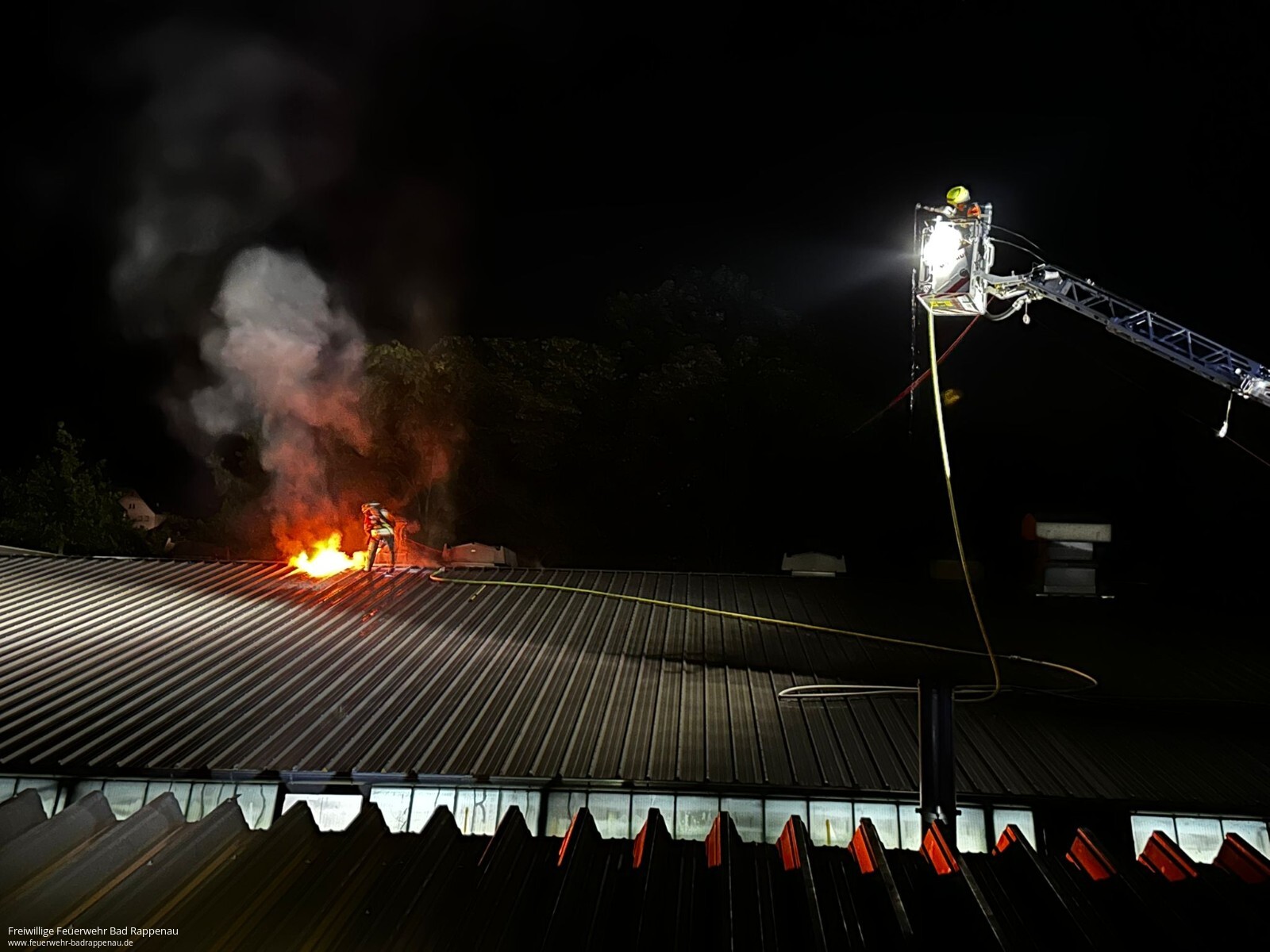 Die Feuerwehr Bad Rappenau rückte mit einem Hilfeleistungslöschgruppenfahrzeug, der Drehleiter sowie dem Kommandowagen zur Einsatzstelle aus. Nach dem Eintreffen wurde die Drehleiter umgehend in enger Abstimmung mit dem Einsatzleiter der Feuerwehr Massenbachhausen in Stellung gebracht und das Dach kontrolliert. Bereits bei der ersten Erkundung mit der Drehleiter konnten offene Flammen auf dem Dach festgestellt werden, die sofort mit dem Wenderohr abgelöscht wurden.