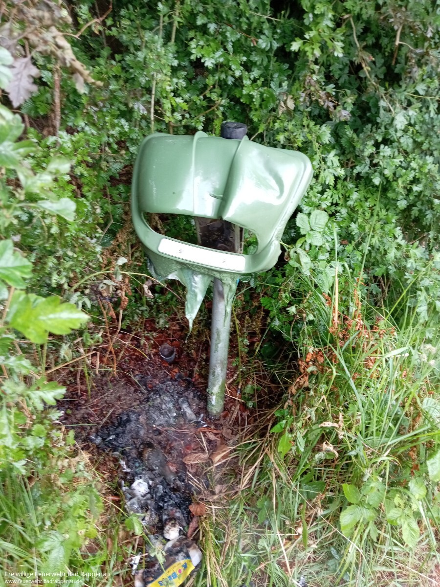 Um 17:04 Uhr wurde die Abteilung Bad Rappenau zu einem Kleinbrand im Bereich des Waldsees alarmiert. Vor Ort brannte ein Mülleimer, vermutlich aufgrund der unsachgemäßen Entsorgung von Glutresten und eines Einweggrills.Hinweis: Wie auf unserem Foto deutlich zu erkennen ist, war es reines Glück, dass es bei diesem Kleinbrand geblieben ist. Nur wenige Minuten später hätte sich daraus ein größerer Brand entwickeln können. Die anhaltende Trockenheit macht derartige Aktionen besonders gefährlich! Einweggrills und heiße Kohlereste gehören keinesfalls in den Mülleimer!Mal ganz abgesehen vom Totalschaden des Mülleimers.