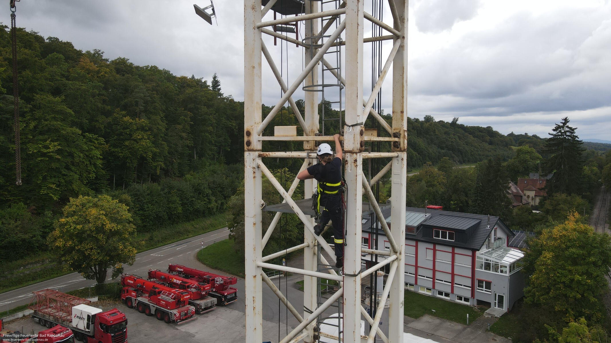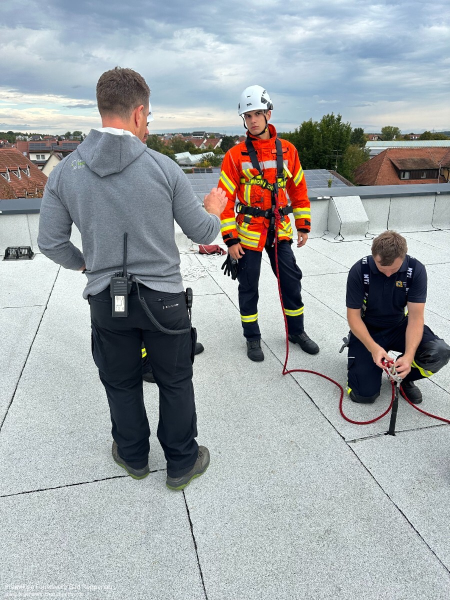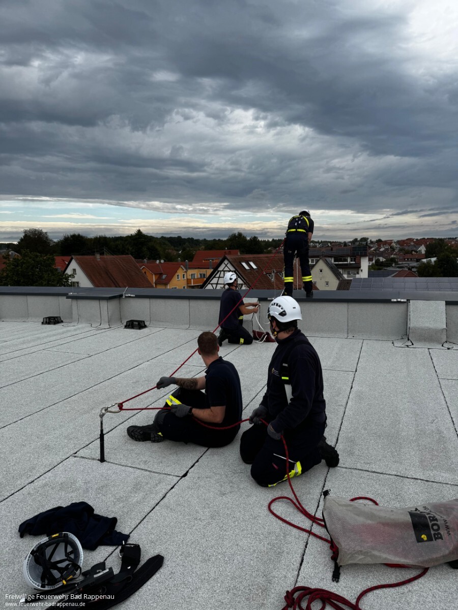 Vom 20. bis 22. September fand bei der Freiwilligen Feuerwehr Bad Rappenau ein Lehrgang zur Anwendung des Gerätesatzes Absturzsicherung statt. Durchgeführt wurde die Ausbildung von der Firma SeilTechnikUlm GmbH.Am ersten Tag stand die theoretische Einführung im Mittelpunkt. Nach Begrüßung und Vorstellung wurden die Unfallverhütungsvorschriften sowie die Unterschiede zwischen Absturzsicherung, einfacher Rettung aus Höhen und Tiefen und spezieller Rettung aus Höhen und Tiefen erläutert. Ebenso wurden Einsatzmöglichkeiten wie Halten, Rückhalten, Auffangen und Selbstretten behandelt. Auch besondere Gefahren wie das Hängetrauma wurden angesprochen. Am Nachmittag folgten praktische Übungen zu Knoten und geeigneten Anschlagpunkten.Der zweite Tag war geprägt von Praxiseinsätzen. Mit Unterstützung der Drehleiter wurden auf dem Dach der Gemeinschaftsverbundschule Bad Rappenau Sicherungsmaßnahmen und das Arbeiten an absturzgefährdeten Kanten trainiert. Anschließend stellte die Firma Rolf Mayer GmbH ihr Betriebsgelände zur Verfügung. Dort konnten die Teilnehmenden am Baukran das richtige Vorsteigen sowie das Einrichten von Zwischensicherungen üben.Am Montag ermöglichte die Firma BRAUN GmbH & Co. KG Stuhlfabrik trotz regnerischem Wetter das Training in einer Halle. Hier konnte mit der Drehleiter das Arbeiten auf einem Flachdach realitätsnah nachgestellt werden. Nach einer weiteren Übungseinheit unter freiem Himmel schloss der Lehrgang mit einer kleinen Theorieprüfung ab, die alle Teilnehmenden erfolgreich bestanden.Der Lehrgang war ein wichtiger Schritt für die im Aufbau befindliche Einheit für einfache Rettung aus Höhen und Tiefen (ERHT) der Feuerwehr Bad Rappenau. Die teilnehmenden Kameradinnen und Kameraden konnten wertvolle Erfahrungen sammeln und ihre Kenntnisse im Umgang mit dem Gerätesatz vertiefen.Ein besonderer Dank gilt der Firma SeilTechnikUlm GmbH für die fachkundige Durchführung und den super Trainer, der Firma Rolf Mayer GmbH sowie der Firma BRAUN GmbH & Co. KG Stuhlfabrik für die Bereitstellung ihrer Übungsorte.