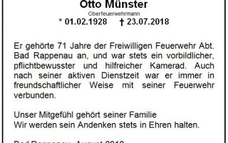 Datum & Uhrzeit: 2018-08-12 Autor: Axel Klumbach, Feuerwehr Bad Rappenau Beisetzung Kamerad Otto MünsterDie Beisetzung unseres Kameraden Otto Münster findet am Montag, den 13.08.2018 um 13:30 Uhr auf dem Friedhof Bad Rappenau statt. Zur Trauerfeier mit anschließender Urnenbeisetzung wird um zahlreiches Erscheinen gebeten.Treffpunkt: