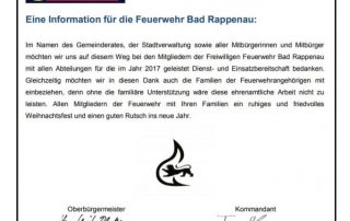 Neujahrswunsch der Freiwilligen Feuerwehr Bad Rappenau an Kameradinnen und Kameraden, Firmen und Mitbürgerinnen und Mitbürger
