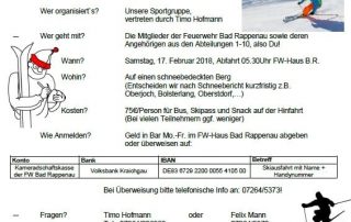 Datum & Uhrzeit: 2017-12-02 Autor: Axel Klumbach, Feuerwehr Bad Rappenau Liebe Ski- und Sportfreunde der Feuerwehr Bad Rappenau,lasst uns gemeinsam die 1. Feuerwehrskiausfahrt der Feuerwehr Bad Rappenau im Jahr 2018 auf die Beine stellen!Wer organisiert`s? Unsere Sportgruppe, vertreten durch Timo Hofmann.Wer geht mit?