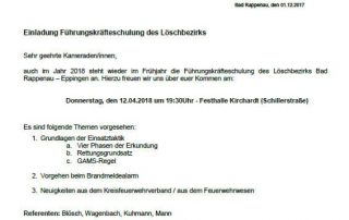 Einladung Führungskräfteschulung des Löschbezirks, 12.04.2018