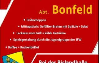 Datum & Uhrzeit: 2017-06-20 Autor: Axel Klumbach, Feuerwehr Bad Rappenau Die Abteilung Bonfeld der Freiwilligen Feuerwehr veranstalten wie alljährlich das traditionelle Grillfest am 02.07.2017. Für ein unterhaltsames Programm ist gesorgt - ein vielfältiges Angebot an Speisen + Getränken steht für Sie als Gäste