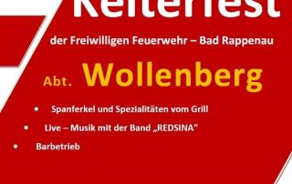 Datum & Uhrzeit: 2017-06-19 Autor: Axel Klumbach, Feuerwehr Bad Rappenau Die Abteilung Wollenberg der Freiwilligen Feuerwehr veranstaltet wie alljährlich das traditionelle Kelterfest am 01.07.2017. Für ein unterhaltsames Programm ist gesorgt - ein vielfältiges Angebot an Speisen + Getränken steht für Sie als Gäste