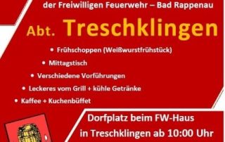 Datum & Uhrzeit: 2017-05-17 Autor: Axel Klumbach, Feuerwehr Bad Rappenau Die Abteilung Treschklingen der Freiwilligen Feuerwehr veranstalten das traditionelle Grillfest am 25.05.2017 beim Feuerwehrhaus / Dorfplatz. Für ein unterhaltsames Programm ist gesorgt - ein vielfältiges Angebot an Speisen + Getränken steht für Sie