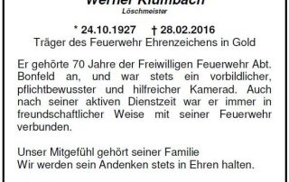 Datum & Uhrzeit: 2016-03-03 Autor: Axel Klumbach, Feuerwehr Bad Rappenau Die Freiwillige Feuerwehr Bad Rappenau, Abt. Bonfeld trauert um ihren KameradenWerner Klumbach - Löschmeister - geb. 24.10.1927 / gest. 28.02.2016