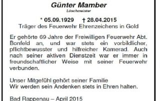 Datum & Uhrzeit: 2015-05-03 Autor: Axel Klumbach, Feuerwehr Bad Rappenau Die Freiwillige Feuerwehr Bad Rappenau, Abt. Bonfeld trauert um ihre KameradenGünter Mamber - Löschmeister - geb. 05.09.1929 / gest. 28.04.2015Manfred Klempp - Oberfeuerwehrmann - geb. 25.06.1939 / gest. 28.04.2015Werner