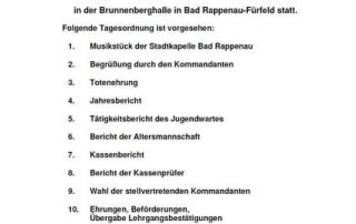 Datum & Uhrzeit: 2015-04-20 Autor: Axel Klumbach, Feuerwehr Bad Rappenau Die Jahreshauptversammlung der Feuerwehr Bad Rappenaufür das Berichtsjahr 2014 findet amSamstag, den 16.05.2015 um 19:00 Uhrin der Brunnenberghalle in Bad Rappenau-Fürfeld statt.Folgende Tagesordnung ist vorgesehen:1.Musikstück der Stadtkapelle Bad Rappenau2.Begrüßung durch den Kommandanten3.Totenehrung4.Jahresbericht5.Tätigkeitsbericht des