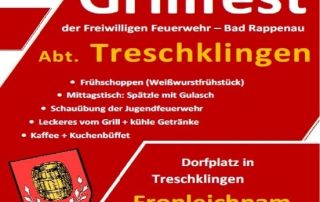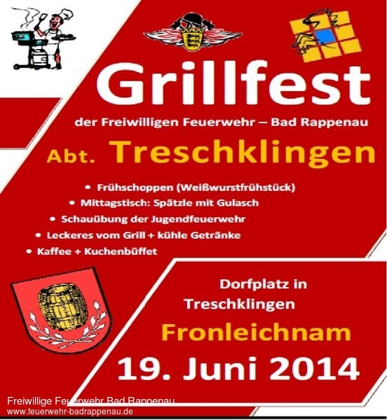 Datum & Uhrzeit: 2014-06-15 Autor: Axel Klumbach, Feuerwehr Bad Rappenau Die Abteilung Treschklingen der Freiwilligen Feuerwehr veranstalten wie alljährlich das traditionelle Grillfest an Fronleichnam am 19.06.2014. Für ein unterhaltsames Programm ist gesorgt - ein vielfältiges Angebot an Speisen + Getränken steht für Sie