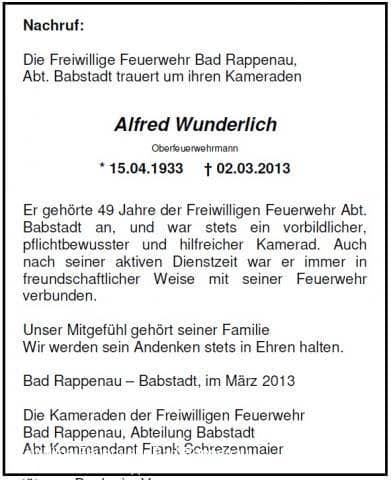 Trauer um Alfred Wunderlich, Kamerad der Altersabteilung Babstadt