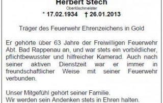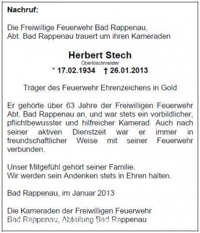 Datum & Uhrzeit: 2013-02-01 Autor: Feuerwehr Bad Rappenau Abt. Bad Rappenau Die Freiwillige Feuerwehr Bad Rappenau, Abt. Bad Rappenau trauert um ihren Kameraden OberlöschmeisterHerbert Stech * 17.02.1934 + 26.01.2013