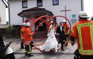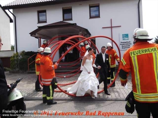 Datum & Uhrzeit: 2012-07-23 Autor: Ralf Schneider, Feuerwehr Bad Rappenau Am Samstag 21.07.2012 heirateten unsere beiden Kameraden der Abteilung Bad Rappenau Karolin Freigang und Michael Mohr im Gemeindehaus der Evangelisch- Freikirchlichen Gemeinde Gemmingen.Die Kameraden der Abteilung bildeten mit luftbefüllten C- Schläuchen einen Spaliertunnel