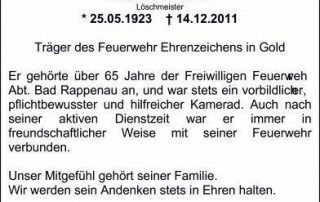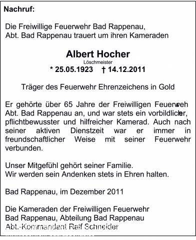 Datum & Uhrzeit: 2011-12-14 Autor: Ralf Schneider, Feuerwehr Bad Rappenau Die Freiwillige Feuerwehr Bad Rappenau, Abt. Bad Rappenau trauert um ihren Kameraden LöschmeisterAlbert Hocher * 25.05.1923 + 14.12.2011Die Beisetzung findet am Samstag, 17.12.2011 um 11:00 Uhr auf dem Friedhof Bad Rappenau statt.