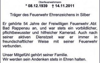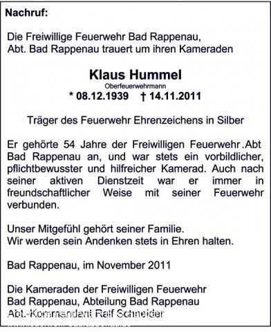 Datum & Uhrzeit: 2011-11-16 Autor: Ralf Schneider, Feuerwehr Bad Rappenau Die Freiwillige Feuerwehr Bad Rappenau, Abt. Bad Rappenau trauert um ihren Kameraden OberfeuerwehrmannKlaus Hummel* 08.12.1939 14.11.2011Die Beerdigung findet am Freitag, 18.11.2011 um 13:30 Uhr auf dem Friedhof Zimmerhof statt.