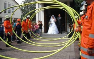 Datum & Uhrzeit: 2011-08-13 Autor: Ralf Schneider / Axel Klumbach, Feuerwehr Bad Rappenau In Bad Rappenau heiratete am Samstag, den 13.08.2011 der Babstadter Kamerad Alexander Teßmer seine Lebensgefährtin Denise.Die Abteilungswehr Babstadt bildete mit luftbefüllten C-Schläuchen einen Spaliertunnel und überreichte
