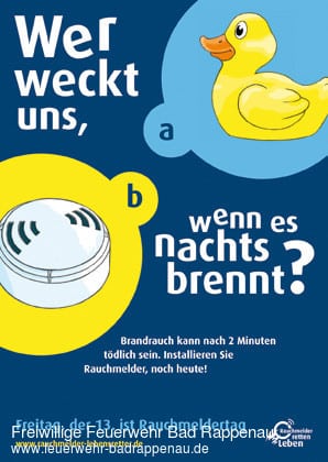 Datum & Uhrzeit: 2011-05-12 Autor: Kreisfeuerwehrverband Heilbronn Freitag, der 13. ist in Deutschland längst kein Unglückstag mehr, sondern bereits zum sechsten Mal bundesweiter Rauchmeldertag."Die meisten Toten bei Wohnungsbränden gibt es in der Nacht", weiß Innenminister Reinhold Gall, Vorsitzender des Kreisfeuerwehrverbandes Heilbronn. Wenn der