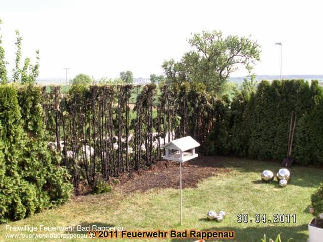 Einsatzart: Kleinbrand Datum & Uhrzeit: 2011-04-30 15:46:00 Autor: Ralf Schneider, Feuerwehr Bad Rappenau Bei Gartenarbeiten war aus bislang unbekannter Ursache eine Tujahecke in der Ilmenstrasse in Brand geraten.Der Brand wurde von einem Trupp unter Atemschutz mittels Schnellangriffseinrichtung durch die Abteilungswehr Treschklingen gelöscht.Die ebenfalls alarmierte